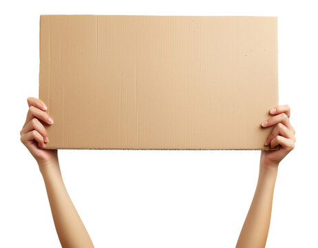 Hands with blank cardboard placard isolated on transparent background