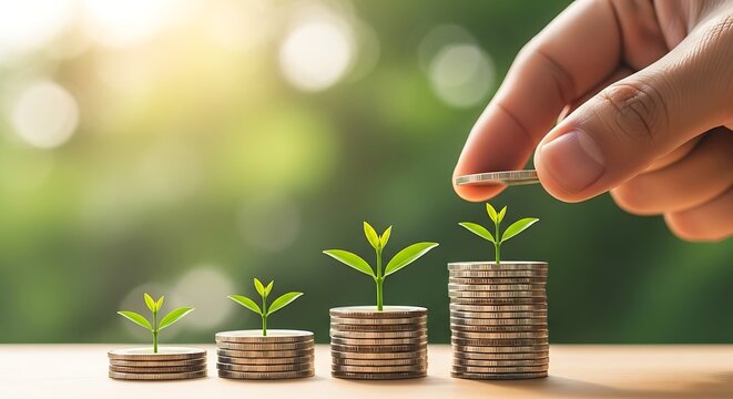 A hand is placing a coin on a stack of coins with a small plant growing on top, symbolizing financial growth and investment