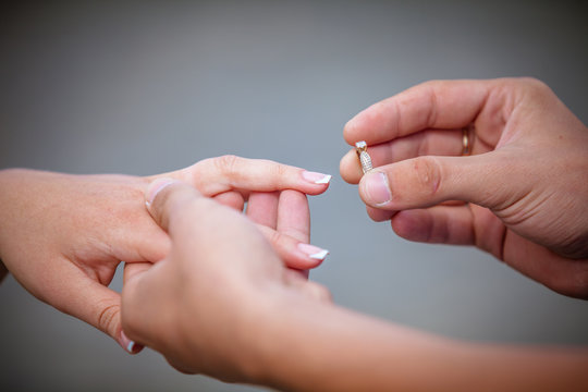 Diverse gay couple exchanging rings outdoor wedding celebration