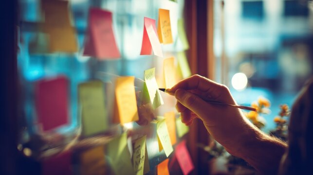 Hands placing sticky notes on glass board or wall faceless brainstorming sticky notes hands office planning idea board professional brainstorm office notes planning hands