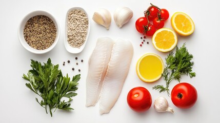Fresh plaice fillets and cooking ingredients arrangement on white background for healthy meal preparation top view