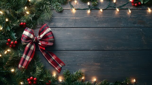 Black and white buffalo plaid Christmas gift bow and ribbon long border isolated on a white background