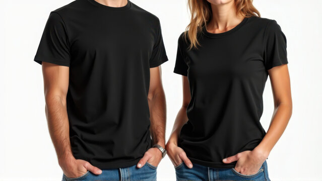 Men and women in a studio style t-shirt mockup, wearing a plain black t-shirt and blue jeans, highlighting their light skin tones and casual attire.