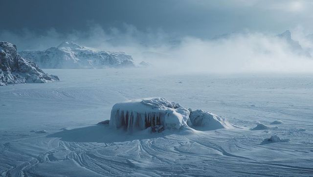 Ice-coated rock standing on frozen polar plain with icicles, sastrugi ridges and peaks