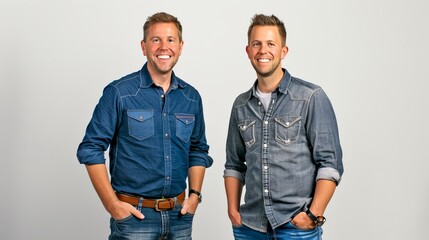 Two cheerful men standing side by side dressed casually in denim shirts, posing confidently against a plain background. Conceptual image of friendship and casual fashion. Medium shot, color photo. AI