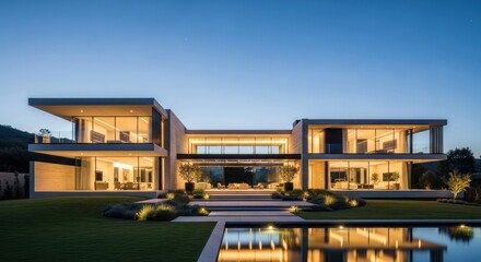 Contemporary architectural marvel evening glow luxurious estate with pool feature