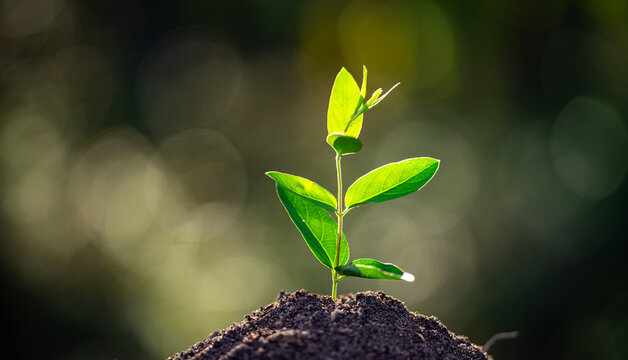 Green plant is growing in the dirt. Sprout grows on a green. Earth concept. Environmental protection. Selective focus with fresh green leaf in soil. Greenery spring season background. Eco farm.