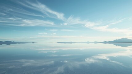 The curve of the horizon is blurred as the sky and earth merge in the reflection on Salar de Uyuni.