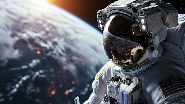 International Day of Human Spaceflight. An astronaut in a spacesuit on the background of planet Earth.