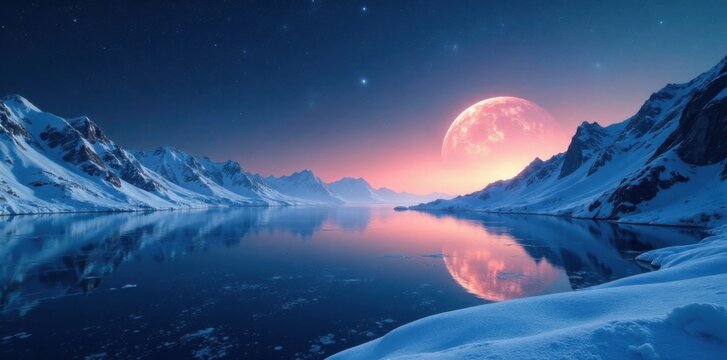Fantasy landscape with large moon and mountains.