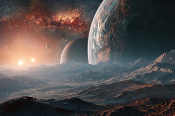 Dramatic galactic landscape featuring vibrant planets and glowing stars in an expansive cosmic setting