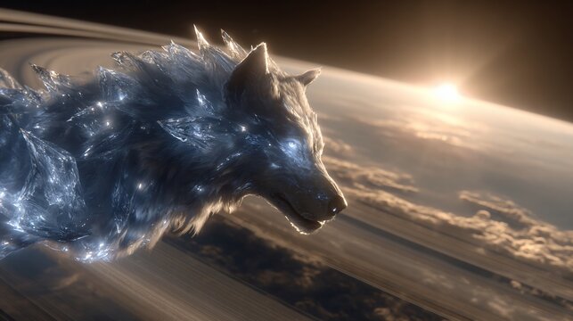 Celestial guardian wolf soaring through space overlooking a ringed planetscape of cosmic beauty