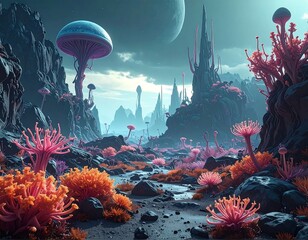 stunning twilight planetscape featuring large glowing moon illuminating dramatic mountain range vibrant colors of sky blend beautifully with landscape creating serene yet captivating atmosphere