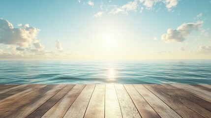 A serene beach scene featuring a wooden platform overlooking calm waters and a bright sky.