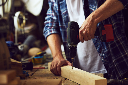 Person Using Power Drill to Fix Wooden Board in Construction Area