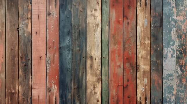 This image showcases various colored wooden planks with a weathered, textured finish, giving a rustic appeal