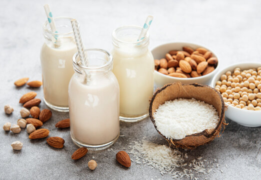 Set or collection of various vegan milk almond, coconut, cashew, on table background. Vegan plant based milk and ingredients, top view