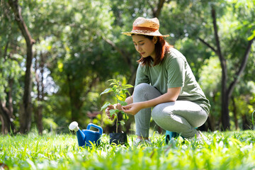 Happy young Asian woman volunteer holding a sapling to plant forests, people and ecology concept, environment Earth Day In the hands of trees growing seedlings, love of nature and care concept