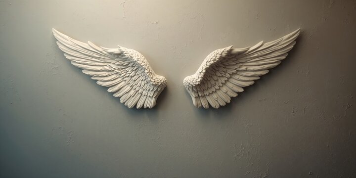 White plaster wings on white background with copy space, Valentine's day, Mother's day, Women's Day and love concept