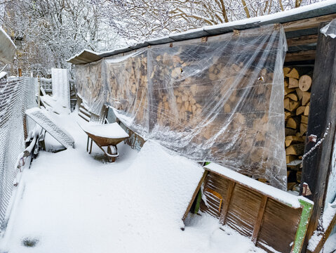 Renovation project showcasing a living room draped in plastic sheeting during preparation for painting and repairs