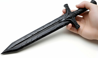 Hand holding a dark, ornate, plastic toy sword against a white background, showing intricate carved details