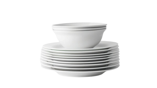 Arranging minimalist tableware with hands placing small glass on stacked white plates