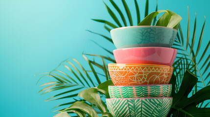 Colorful bowls stack with tropical plants and leaves, empty copy space