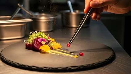 Close-up shot of a expert chef plating a gourmet dish in high-end restaurant delicately arranging the ingredients with culinary finesse