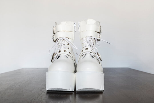 Front-facing platform boot with metallic accents, fashion-forward design, clean white backdrop