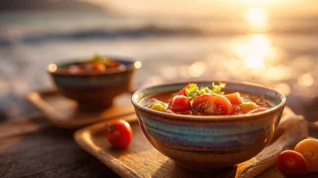 Fresh vegetable vegetable salad in rustic bowl with sunset water reflection background.