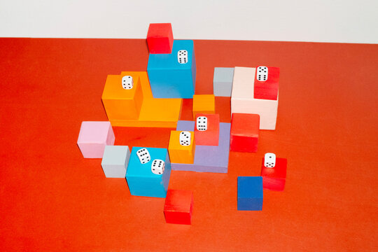 Colorful geometric objects cubes and dice with hard direct flashlight