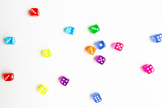 Colorful dice scattered on white background showing numbers