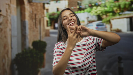 Woman smiling and making a hashtag sign with fingers on a sunlit street with stone building facades; hashtag play joy.