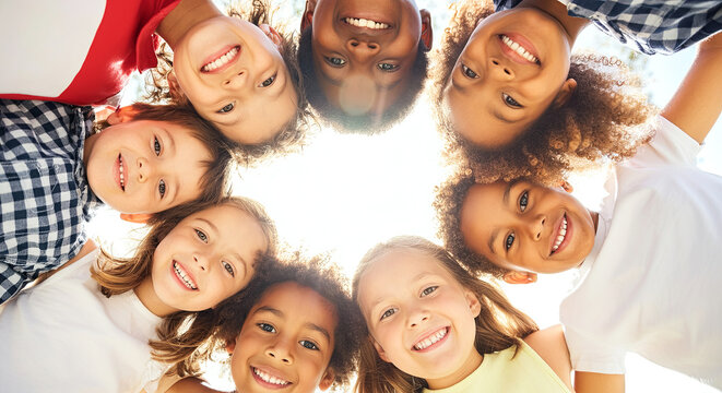 A joyful group of children forms a circle, smiling brightly under a sunny sky