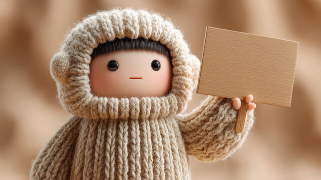 Doll holding sign, brown and gray colors, soft lighting, smooth texture, playful and whimsical feel, suitable for children's products, marketing campaigns, website banners, and social media graphics