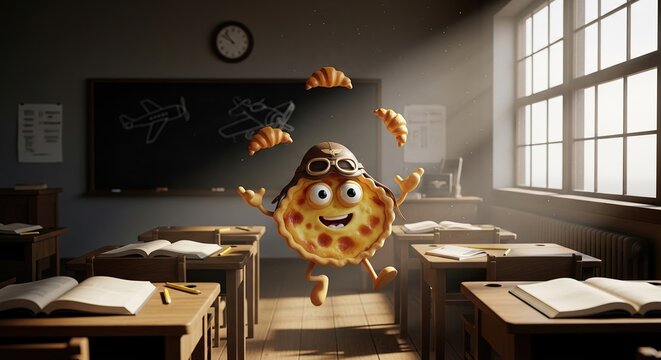 Cheerful cartoon pizza mascot leaping in bright classroom with wooden desks and chalkboard drawings of airplanes