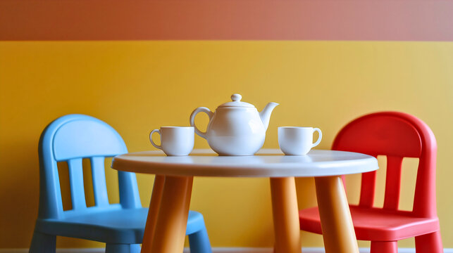Hosting imagination tea party at home, playing with toy cups and saucers, pretending to drink tea, playful fantasy game, childhood fun indoors on table