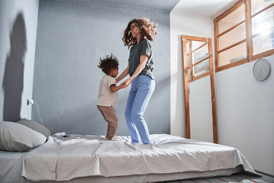 Happy mother jumping at the bed with her multiracial daughter while feeling great