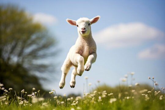 A young lamb full of the joys of spring jumping in the air