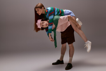 A fashionable young couple exhibits their style while playfully posing in a grey studio