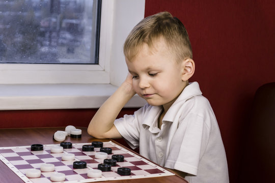 Little boy playing checkers board game