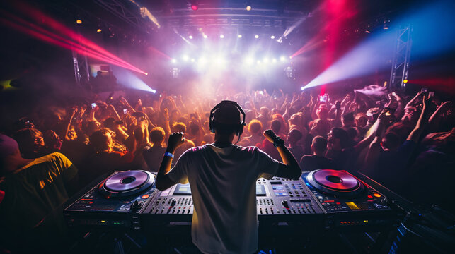 woman claps his hands at musical concert in a crowd of people. clapping crowd at singer's concert. smoke, applause and hands in soft focus, abstract background