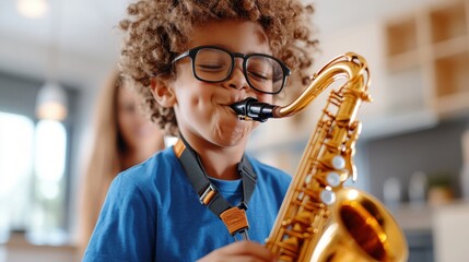 student boy plays saxophone while sitting at a music lesson in class