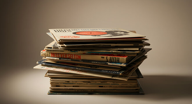 A close-up view of stacked vinyl records showcasing colorful covers, highlighting a collection of classic and modern music.