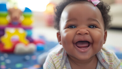 Smiling black baby boy crawls on wooden floor playing with colorful toy truck and blocks. Toddler with curly hair enjoys playtime indoors in sunlit room. Young child explores fun.