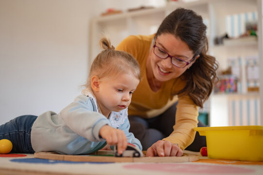A young woman and a little girl play together on the floor with a wooden toy train, engaging in creative and educational playtime in a warm, nurturing environment