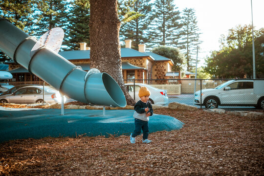 A toddler enjoys playtime in a vibrant park with colorful equipment for activities
