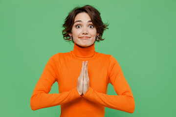 Young pleaded woman 20s in orange turtleneck hold hands folded in prayer gesture, beg about something isolated on plain pastel light green color background studio portrait People lifestyle concept