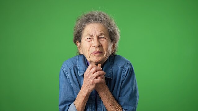 Portrait of tired, sleepy elderly senior old woman hold hands folded in prayer begging about something making wish keep fingers crossed isolated on green screen background studio.
