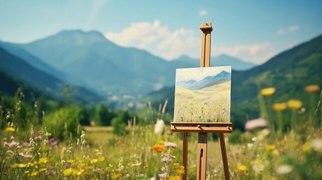 A blank canvas on a wooden easel in a green grass field under a blue sky.